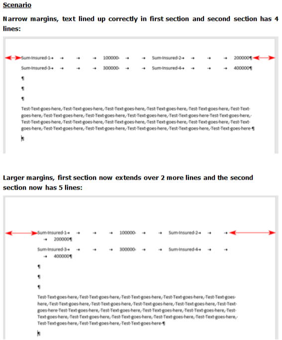 - When the margins in the Schedule document are different from the margins in the Invoice Template, the text may wrap at different points.