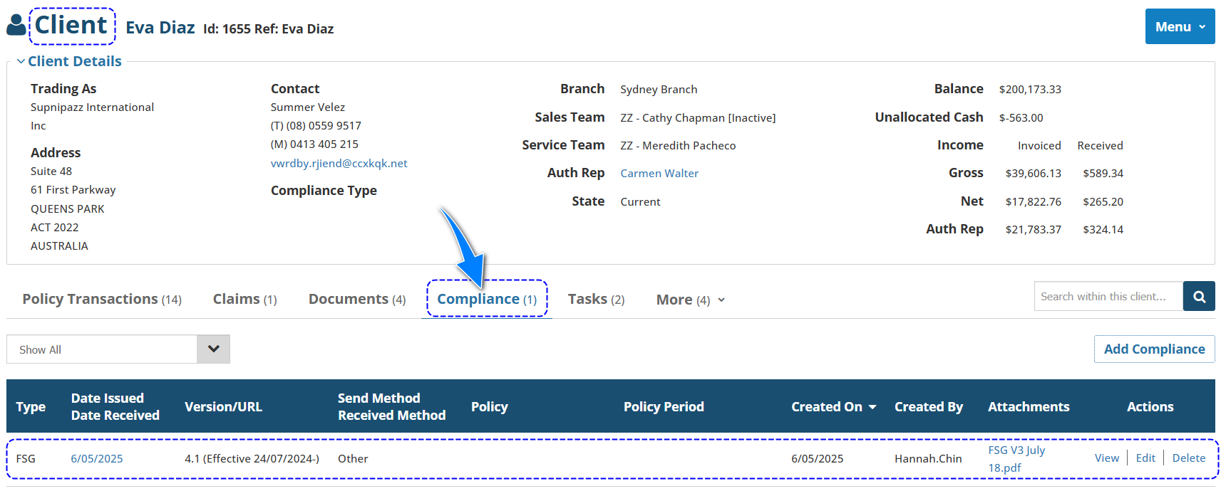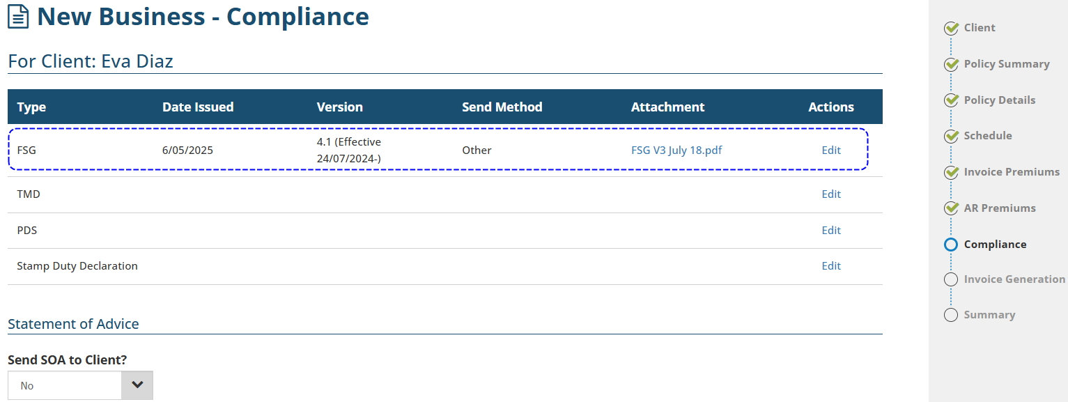 You can add, edit and track the FSG version, using the Compliance tab in the Client profile or the Compliance page in the Policy wizard.