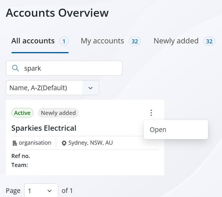 Locate the Account you wish to update using the Account Overview page or by using the Search Bar and click on the three vertical dots menu to see More Options, from there you can Open the account