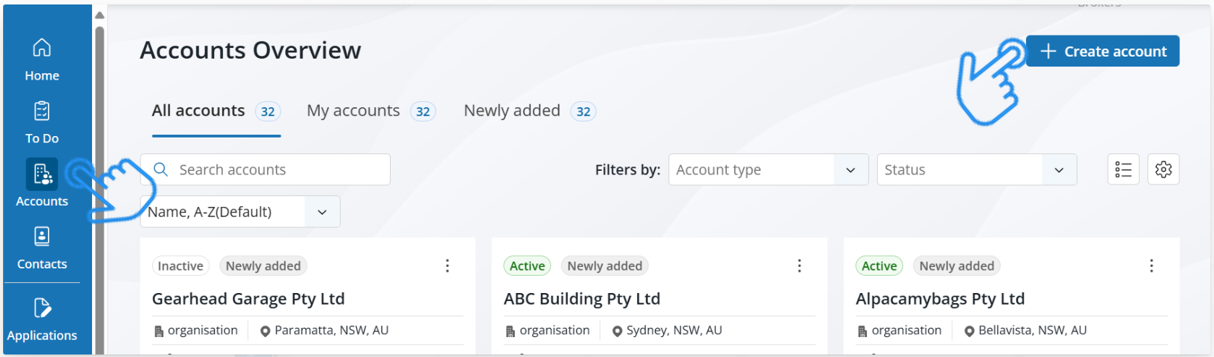 QUICK TIP: Use the method that suits your workflow! Whether you're on the home page, navigating through the left menu, or using the quick action bar - Steadfast Apps makes it easy to create an account from wherever you are. Look for the “+ Add Account” or “+ New” button to get started in seconds.