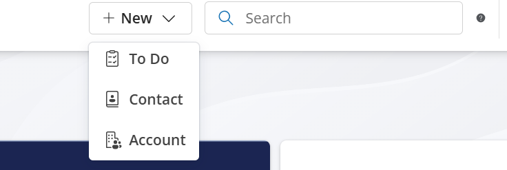 - Quick Action Bar - Click the “+ New” button at the top of the screen.