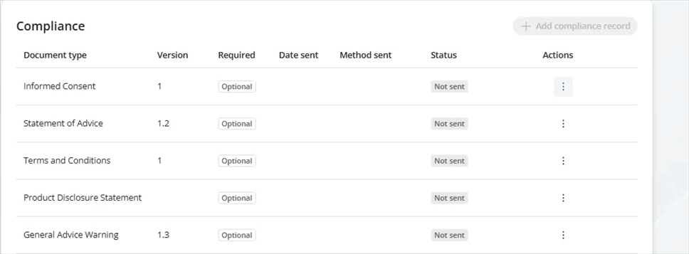 | Smart Compliance, Built for Flexibility If your Administrator has preloaded all compliance document types, the Add Compliance Record button will be greyed out. But if any are missing, the button becomes active - letting you add only what’s not already listed. When adding a record, you’ll choose the document, mark it as required or optional, log the method and date sent, and set the status. | |